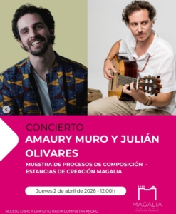 Los músicos Amaury Muro y Julián Olivares comparten en este concierto sus últimos trabajos, desarrollados tras una estancia de creación en el Castillo Palacio de Magalia. A Julián y Amaury les une una complicidad labrada con los años. Han colaborado en la producción, arreglos y grabación del album Mil formas de estar de Amaury. También en la grabación y composición conjunta de otras canciones y en varios conciertos. Comparten gustos e influencias musicales tanto como referencias estéticas o literarias.