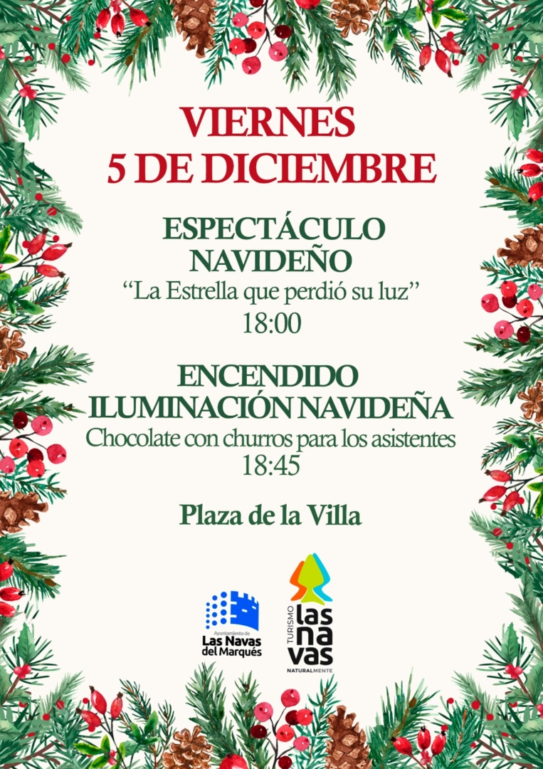 Tras el espectáculo, llegará el instante que todos esperan: la primera luz brotará del corazón del pueblo, en la Plaza de la Villa, ascendiendo por el gran árbol y extendiéndose calle a calle hasta envolver Las Navas en un resplandor que anuncia el comienzo de la Navidad.