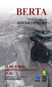 El viernes 16 de enero, a las 19:30 h, la Sala Polivalente de la Biblioteca Municipal acogerá la presentación de Berta, la nueva novela de Antonio Ventura, con la participación de Miriam Esteban como presentadora.